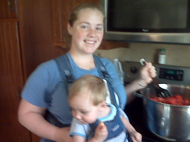 We started off on Saturday morning picking tomatoes and then picking through (and cleaning) a pick-up load of apples, which we ran through our apple press. It was a beautiful morning, not too hot and windy enough to keep flies away (had a lot of bees buzzing around us though). We ended up with about 40 gallons of apple cider. While the cider was being made, Rachel – and Toben – worked on cleaning the tomatoes for the first batch of sauce for the weekend.