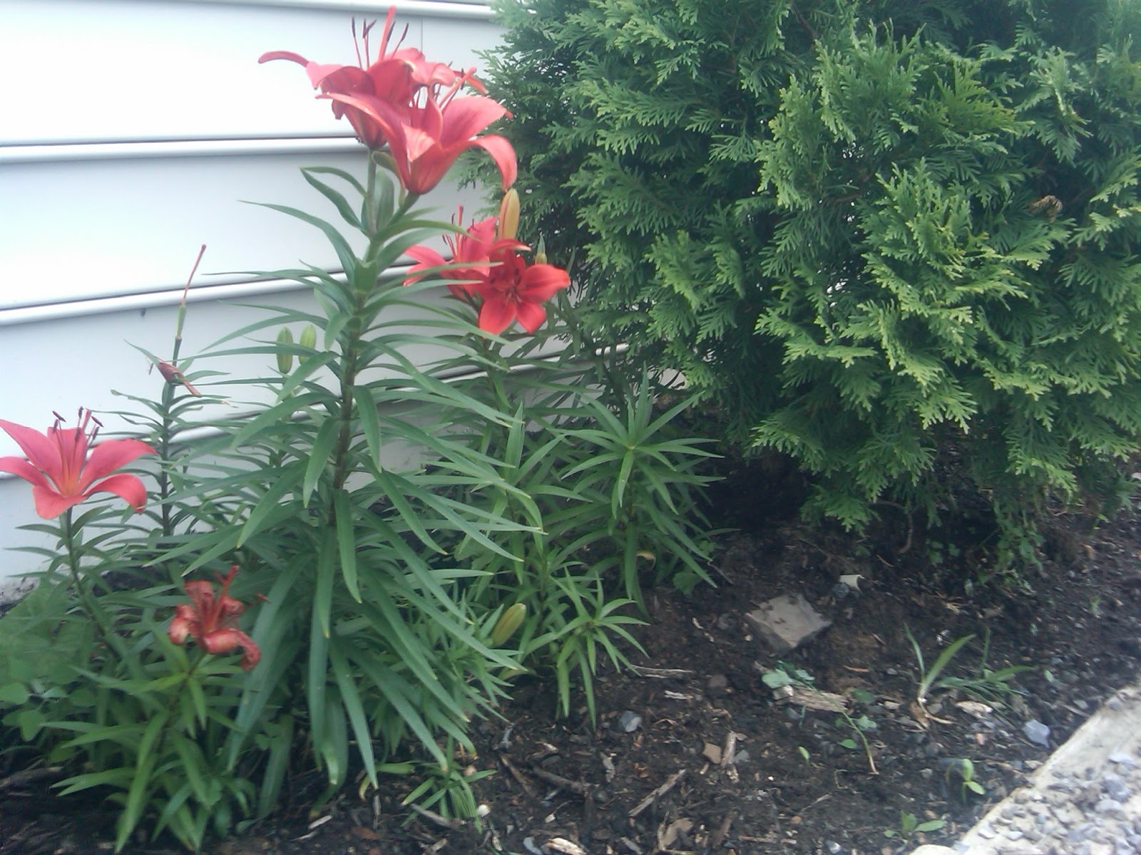 Jeff helped earlier in the week to pull out one last stubborn tree root (with Zach’s tractor), so there is no more barrier to continuing the stone wall building project – except finding the extra time. Also weeded the flower beds alongside the house, where the lilies started blooming.