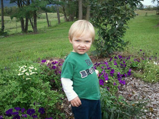 Chronicles of the Long Shot Farm > General > Toben Visits “Nani’s” Garden Share: Toben Visits “Nani’s” Garden Posted on September 17, 2011 Picking “apples” off the tomato plant in the herb garden Trying to pick petunias Stone wall looks a lot bigger with Toben in front 🙂 on the gaudy dog that Zach insisted we need as grandparents