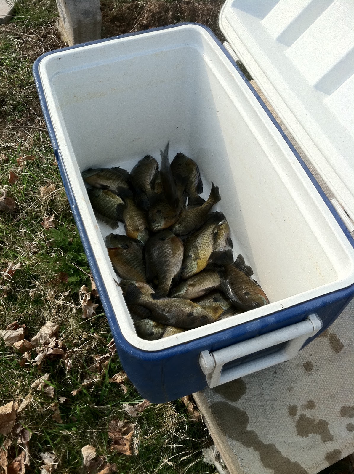 Tina and Lars went to visit Zach, Rachel, Toben and Fiona in Ohio over the weekend, Sammy had to work and Jeff spent most of his time pointing rocks in the barn. When it was time to take a break, Jeff could not resist the warm weather and figured he’d try to maybe catch a bass, thinking it would be way too cold yet for bluegills to be active. But on Sunday afternoon he got lucky, and – to use his words – all of a sudden the pond was just bubbling with bluegills that had come toward the surface. Yes, he caught some, cleaned them and we’ll have fish for dinner on Monday 🙂