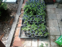 The process of transplanting seedlings from flats (I just sowed them in little rows), into individual pots has taken well over a week.  For “pots” we use either the 9 oz or 18 oz plastic drinking cups – after we make a hole in the bottom of each cups. Holes are made by holding a long nail in a pair of vice grips over a small torch, to heat the nail, and then punching it through about a dozen cups at a time.