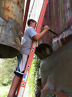 On Saturday, we got the barn and tractor shed roofs painted – by a team of South Carolina barn painters that travels up and down the east coast. They had huge sprayers, special roof paint and they managed to get the entire roof done in less than an hour. It looks so much better!!!