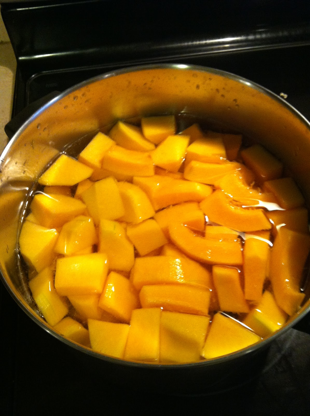 After peeling and seeding, we cut the pumpkins into chunks, rinsed them and put them into a large pot to which we added some water.
