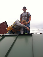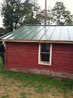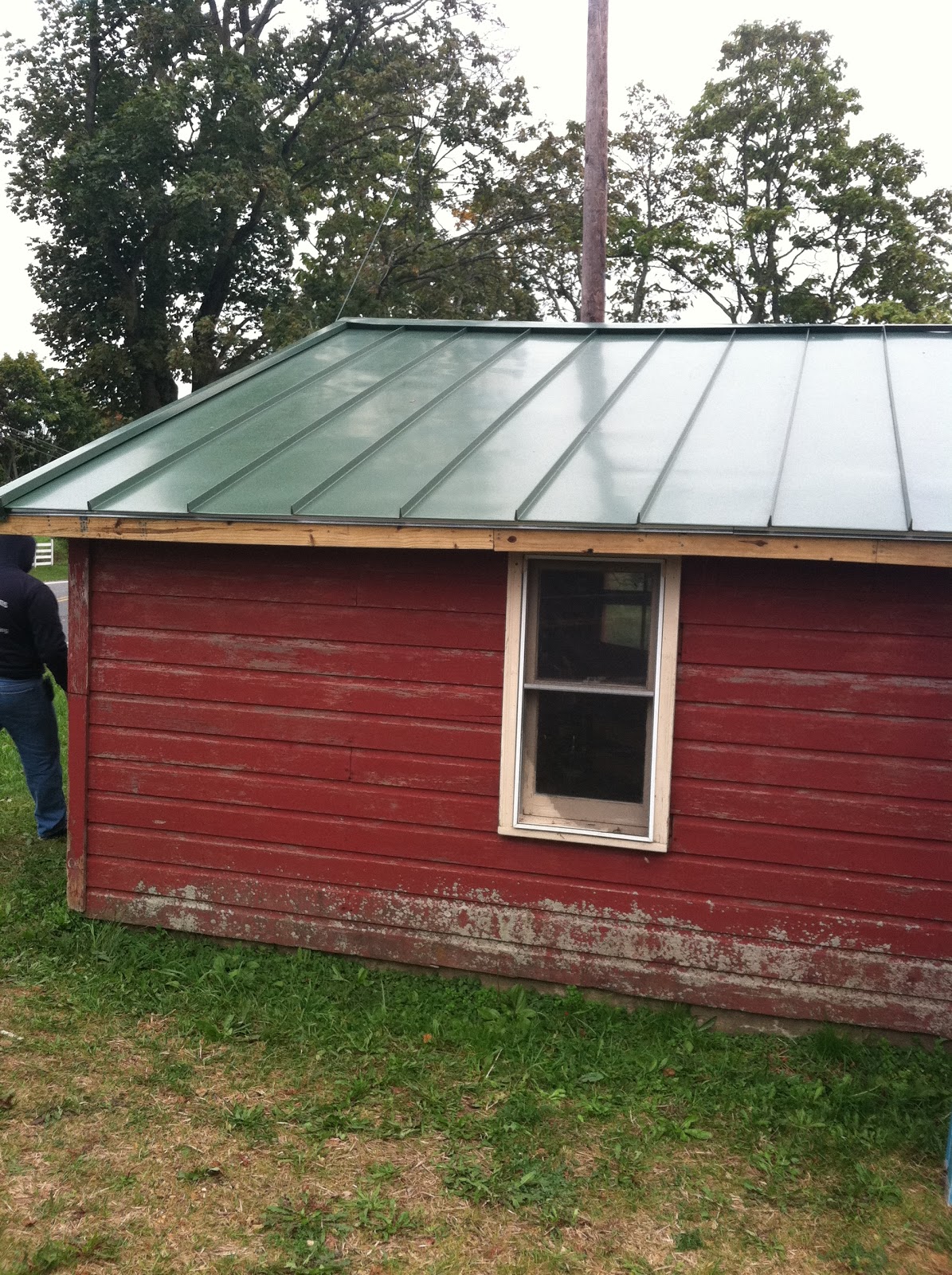 Despite the weather forecast, we did not get any rain until late on Sunday afternoon, so we were able to work more on our shed roof. Over the last 2 weeks, we finished putting up the long roof pieces on both sides, so now we were ready for the finish trim and the roof cap. This turned out to be more time consuming than the big pieces. We worked on Saturday for a few hours, and then again on Sunday (it got a lot colder and we had to take a break just to warm up again).