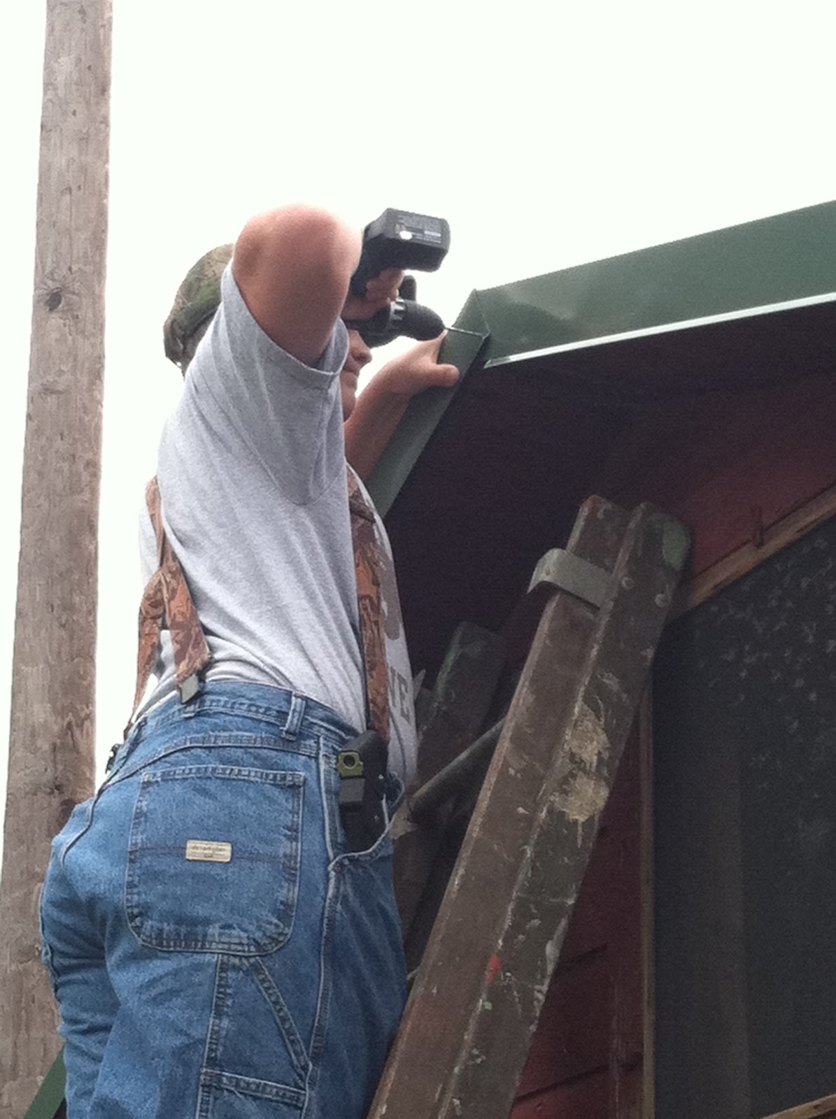 Two pieces of specially formed metal had to be screwed along the angles edges, forming the front trim – the bottom piece had to screwed on, the top piece got pop-riveted. We were able to finish the road side trim up along both edges, and attached the first section of the roof cap before it started raining.