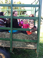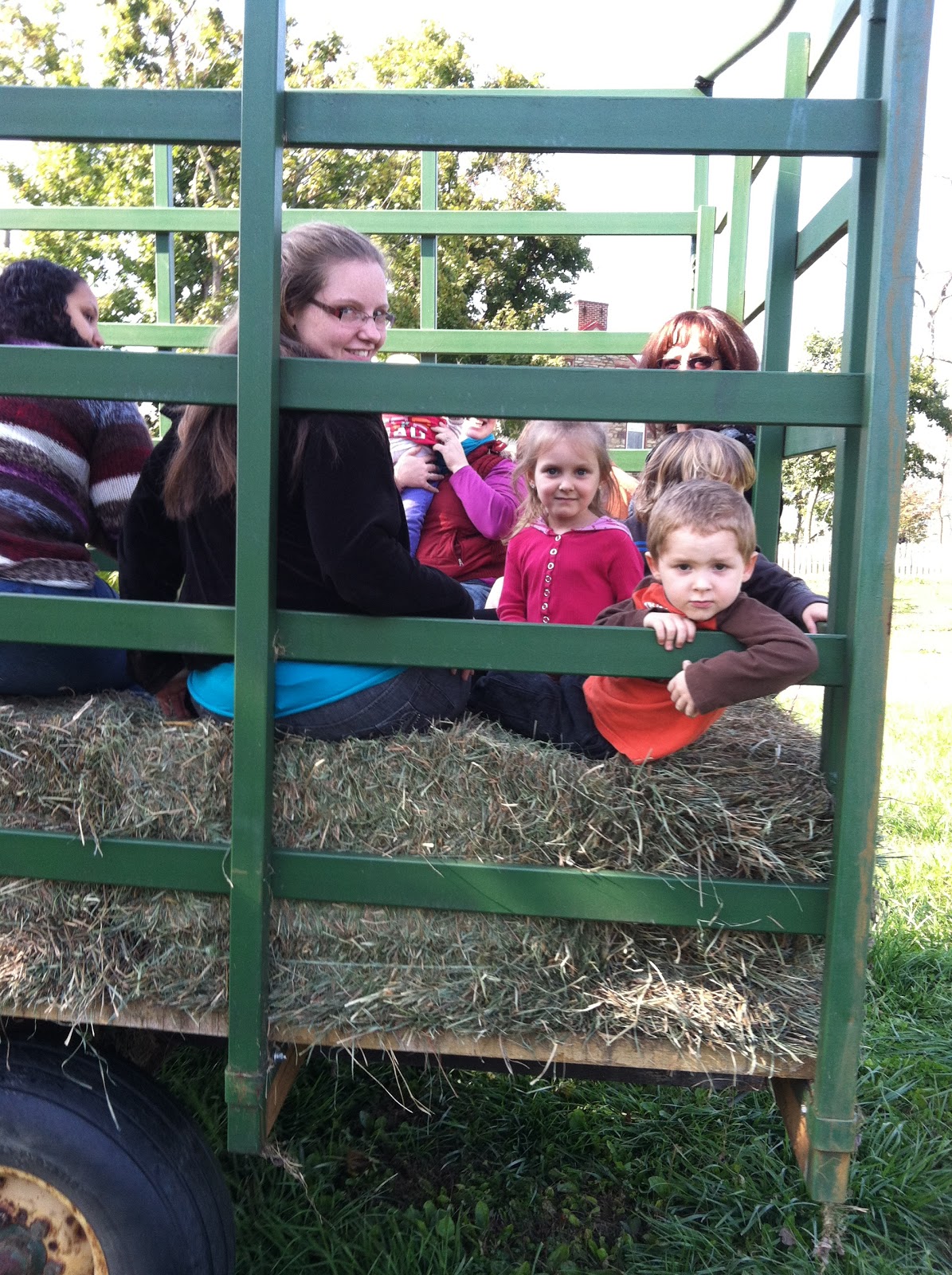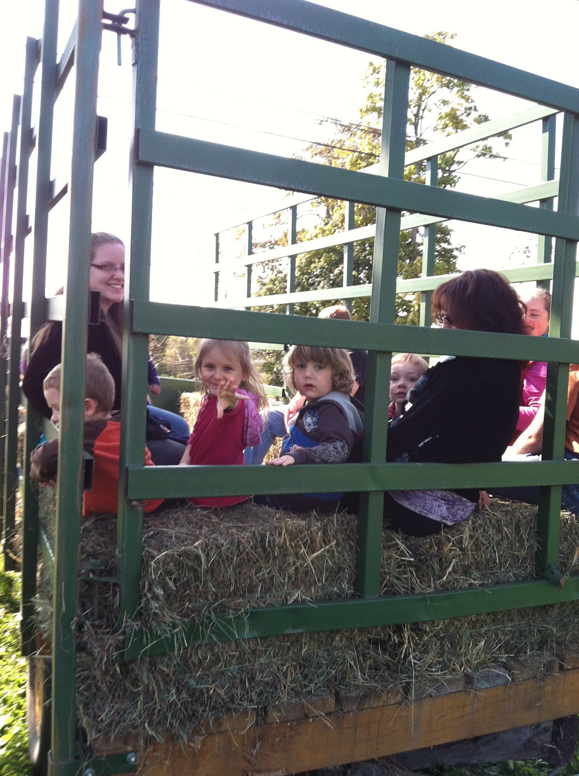 Overall, we had about 40 people, including a dozen kids – all under the age of 4. Caleb brought over his hay wagon, with some hay bales, and took all the kids and some parents for a ride around the farm.