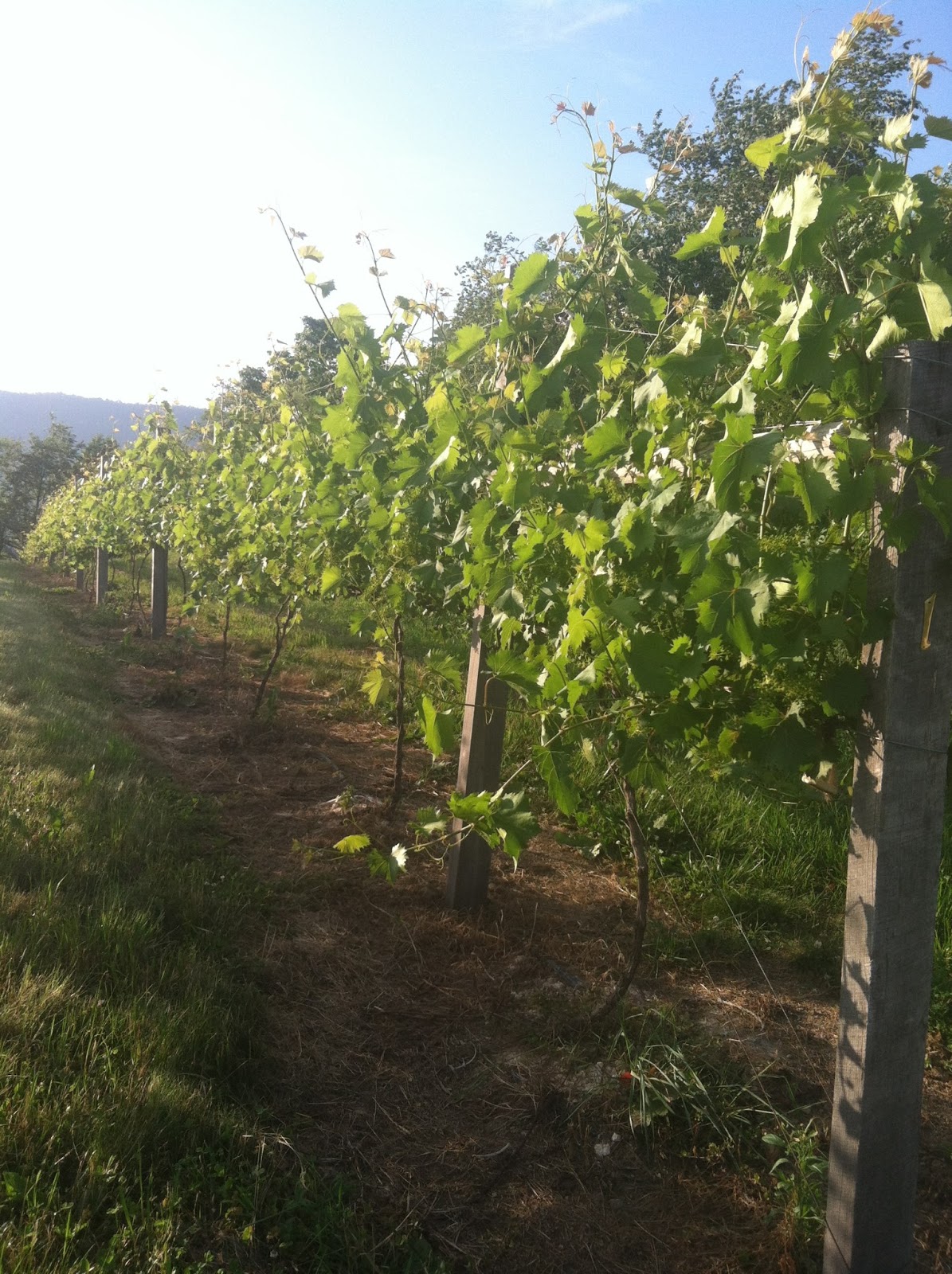 Chronicles of the Long Shot Farm > Grape > Chambourcin Grapes in June Share: Chambourcin Grapes in June Posted on June 14, 2013 Our 3 year old Chambourcin grapes are growing up: by mid June, most shoots have reached the second wire and grape clusters are filling out.