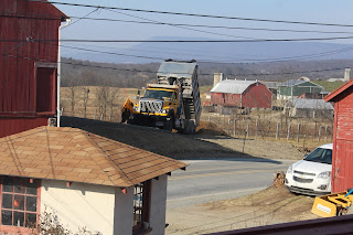 A PennDOT crew arrived today to start reshaping the bank below our vineyard.  (Their backhoe had been parked in our field since before Christmas.)  The timing was perfect:  It was an unseasonably warm day, the ground was dry, and we had just finished roughing out the driveway and parking lot area.