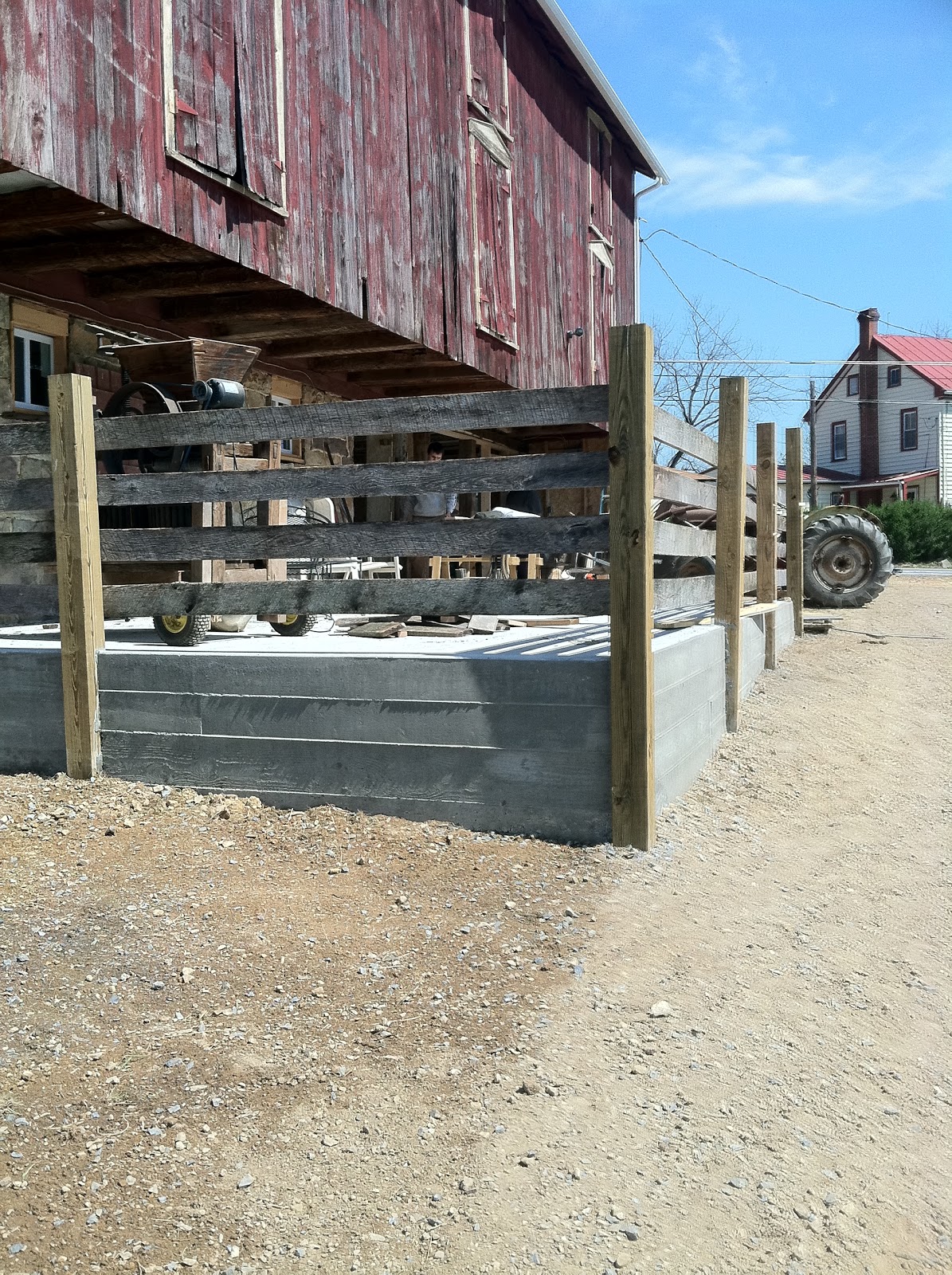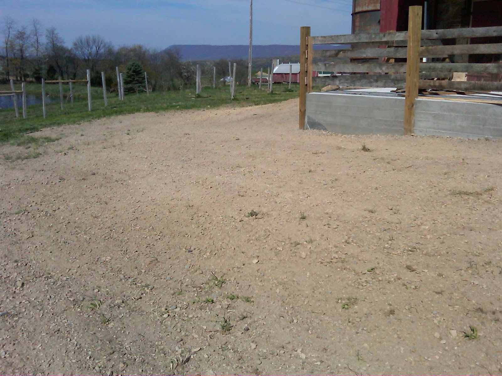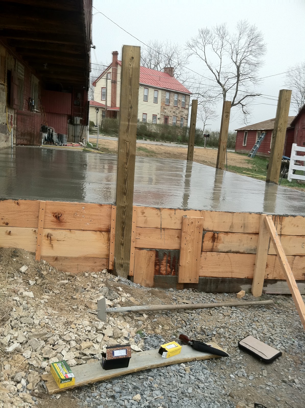 Cement was delivered and poured earlier this week for what we are calling our future crush pad. This is a section right in front of the barn where the outside floor is level with the inside barn floor, which will make it really easy to roll out our cider press. The section is also high enough off the ground on the far end to line up with a trailer or bed of a pick-up truck.  This area could also be used as a patio, since it offers a nice view of the pond and grape vines – or, if need be, it could double as a dance floor! Another large project done…just in time, because on Friday we are getting our order of 500 new grape vines!!!!
