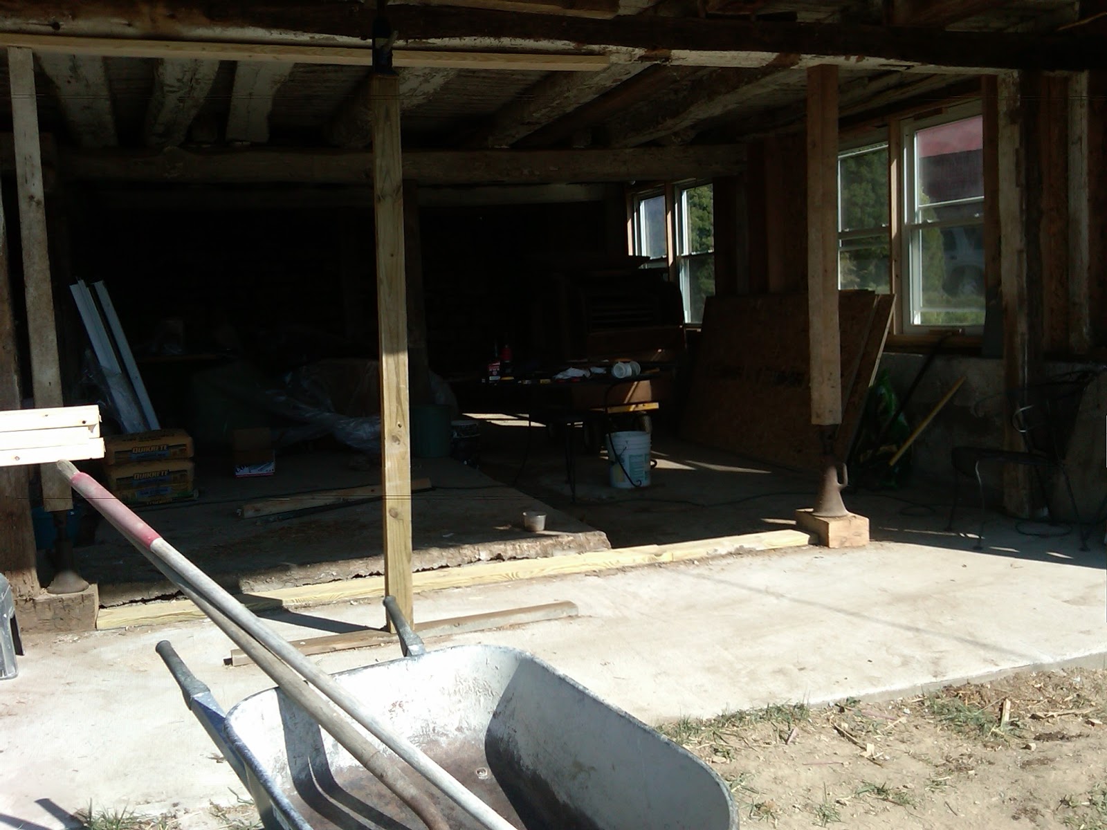 After preparing the inside walls all week (jacking up the outside corner of the barn, cutting new posts, and cutting a load of 2×6’s for supports), we spent Saturday and Sunday tearing off half the downstairs wall of the barn. The new posts and supports were set, and the jacks carefully removed.