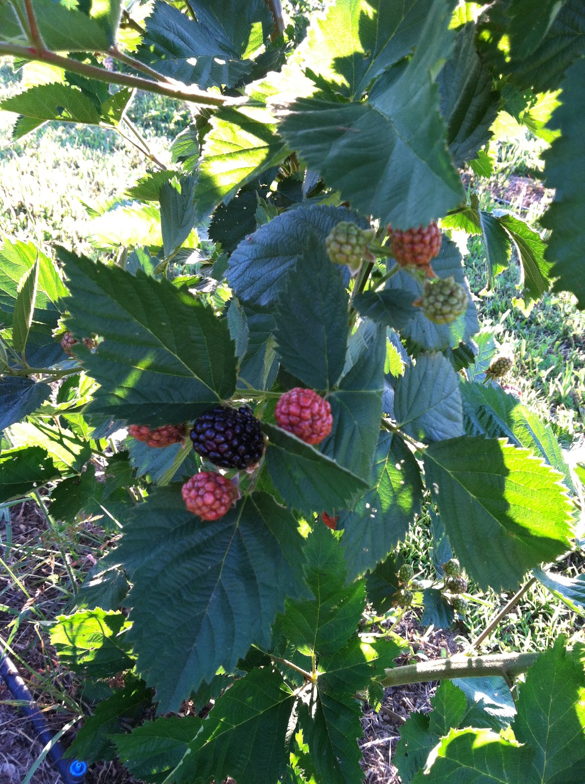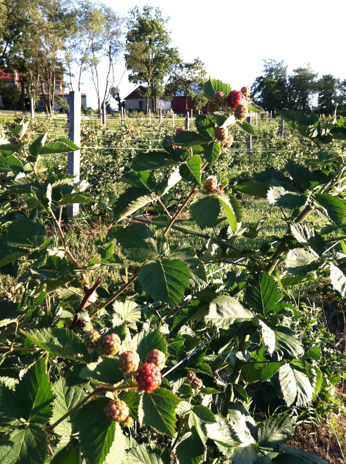 To help us better estimate the start of the “picking season”, we are documenting the progress of our blackberries from blossom stage to fully ripened stage this year. Actually have had a few black berries – but not fully “filled out” yet, and the center is still firm. With other words, they are not fully ripe yet. Considering there are about 500 berry bushes, and so far we found about one dozen firm black berries, they are not even close to being ripe. Here is what the “Apache” berry plants looked like this evening: