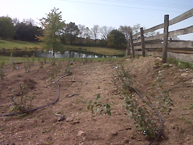 First we made the patch a lot larger (with the tractor), dug holes with a spade :), planted and then ran irrigation lines.  Luckily we still had some line left over, plus enough emitters to make this work. We’ve been irrigating every day since we planted..