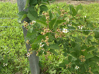 The blackberry rows are an arduous task, we can only work a few hours on this at a time, so it is taking a while.  We not only trim the stems, but control how many stems per bush we want to keep – selecting the strongest and making sure none of the branches shade out other stems.  Then we manually pull the weeds around the bush, just within weed-whip range.  All the trimmings are dropped between the rows.  Eventually, Jeff will run the bush hog through each row, which pretty much destroys even the thickest bramble branch.  Then we will run the weed-whip along the rows to clean up the final weeds.