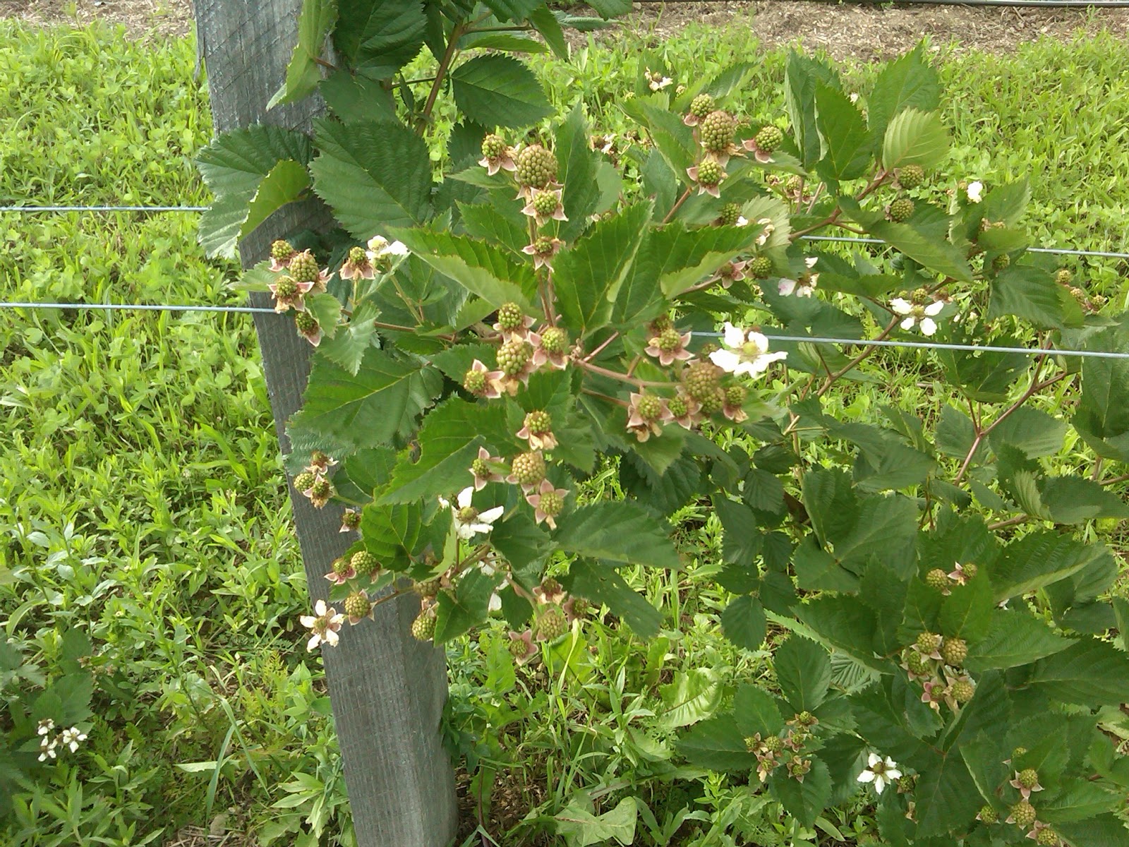 The blackberry rows are an arduous task, we can only work a few hours on this at a time, so it is taking a while.  We not only trim the stems, but control how many stems per bush we want to keep – selecting the strongest and making sure none of the branches shade out other stems.  Then we manually pull the weeds around the bush, just within weed-whip range.  All the trimmings are dropped between the rows.  Eventually, Jeff will run the bush hog through each row, which pretty much destroys even the thickest bramble branch.  Then we will run the weed-whip along the rows to clean up the final weeds.