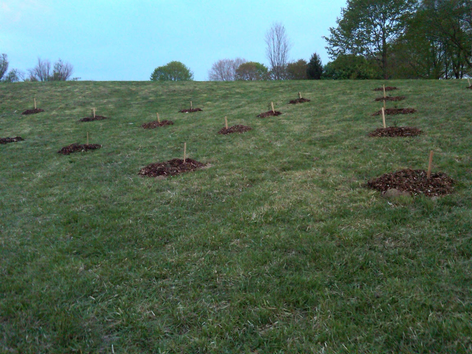 We picked up 20 Frazer fir tree seedlings at the Cumberland County Conservation District annual tree sale and ended up planting them in a somewhat random pattern on the steep slope by the small pond. They are still rather small and we put a lot of mulch around them so that we can “find” them and not accidentally mow them off.