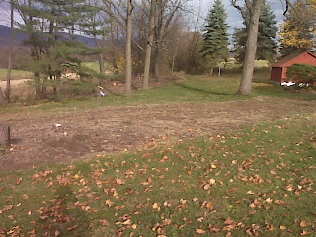 It was a beautiful fall weekend, and we got a lot of things done outside. The backyard’s overgrown, messy flowerbed is no more: after Tina transplanted all perennials worth saving to other flowerbeds and moved all the scattered large stones to the future stone wall, Jeff pulled out most of the tree-stumps with the tractor and then used his grader to level the ground. Only two stumps could not be removed – one of the Magnolia trees is planted between them and they will now anchor a much smaller flowerbed. After Jeff raked the space smooth, Tina spread grass seed over the bare ground. Not sure it will still grow this fall, but it was worth a try, since the seed was left over from the spring planting in front of the house. We then removed the round turtle pen and mowed off the weeds (the turtle – being a desert creature – had to be moved inside for the winter).