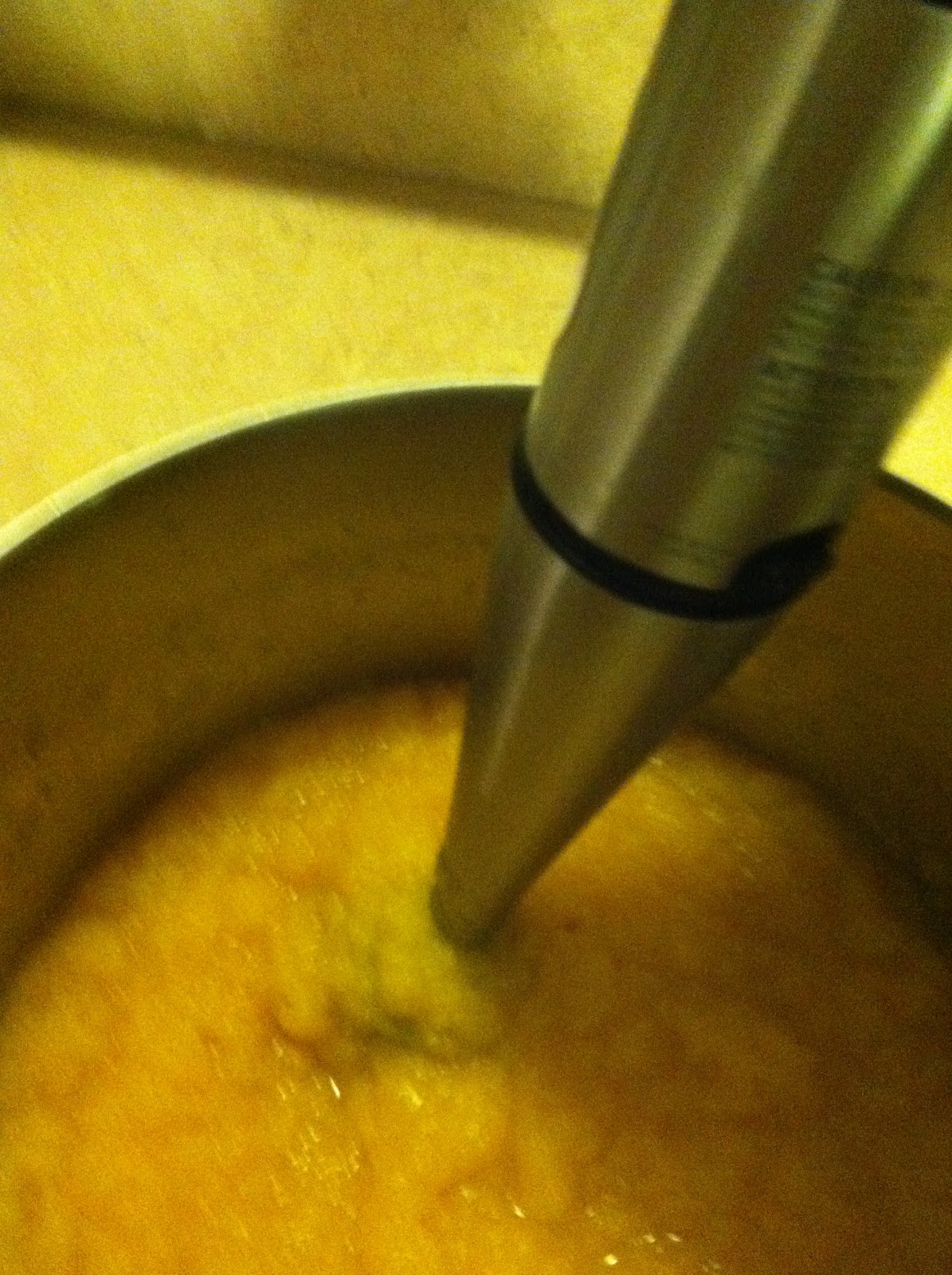 We boiled them until tender – just a few minutes – drained them and let them cool a bit.  I then used my trusty immersion blender, and mashed them into a smooth pulp.  This can be substituted for any canned pumpkin that recipes call for.