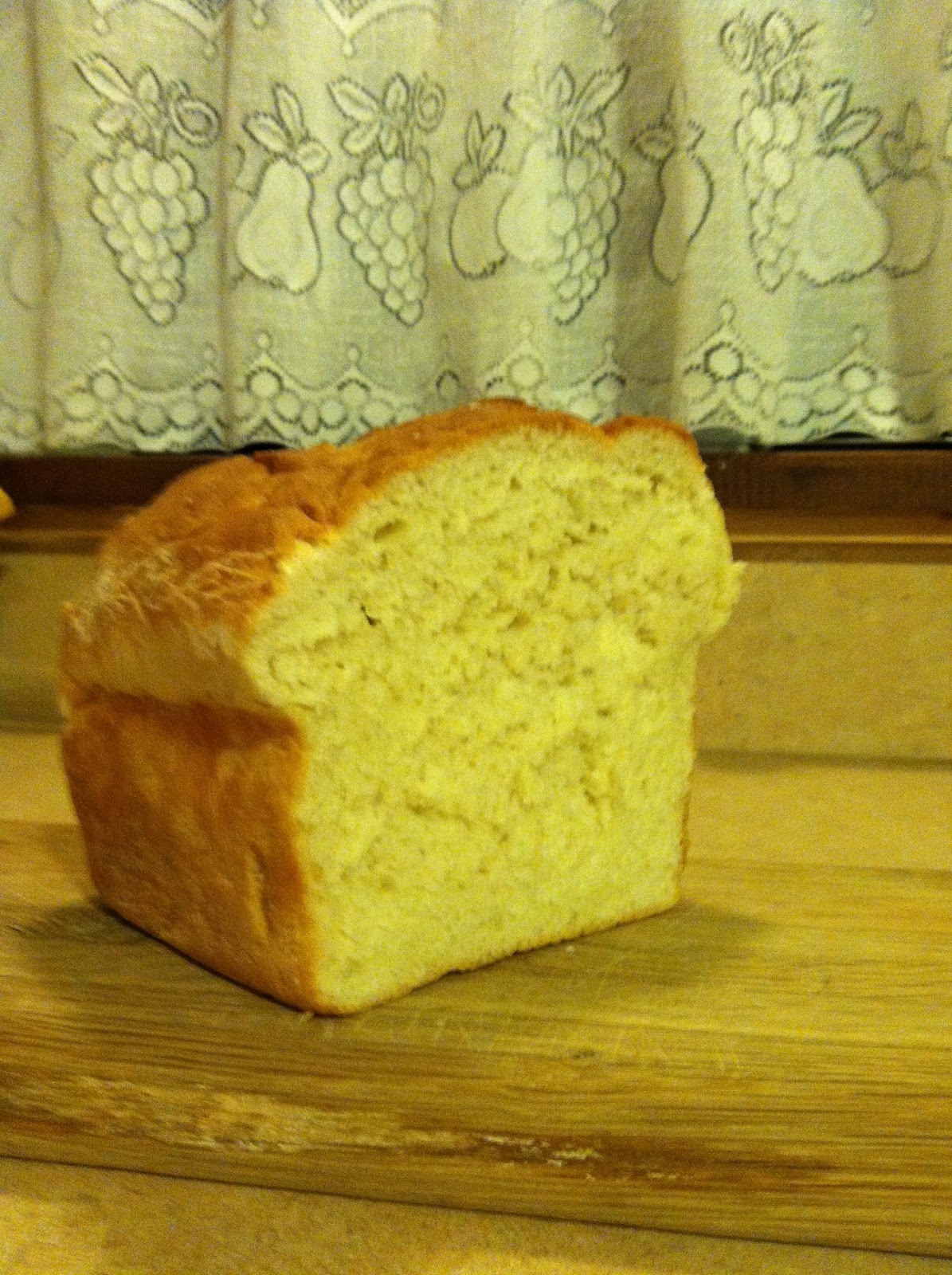 Place ingredients in bread machine, use “dough” cycle.  When done, punch down, knead enough to get air bubbles out (add some more flour if dough is too sticky).  Place in greased loaf pan and let rise a bit more.  Preheat oven to 375 degree F.  Bake bread for 25 minutes, until top is lightly browned.  Remove from oven and brush top with melted butter to keep the crust soft.