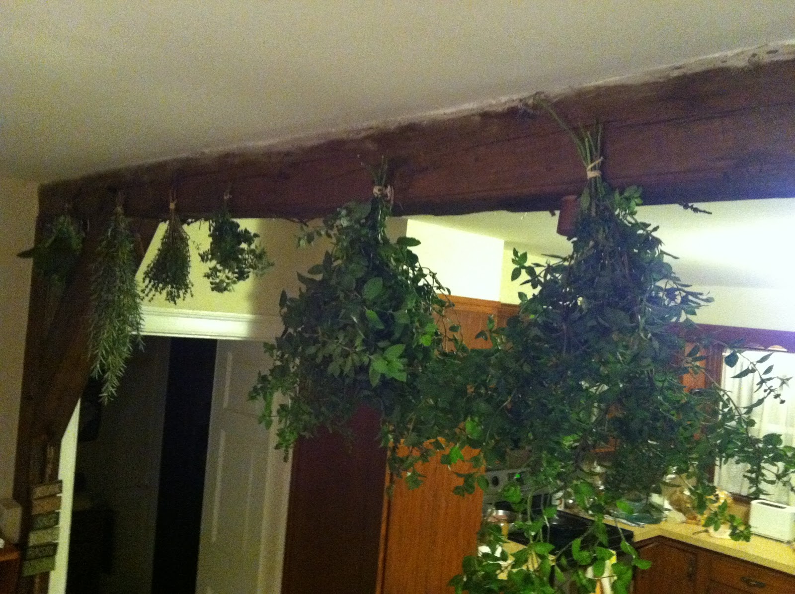 | Fresh herbs hung up to dry in the kitchen |